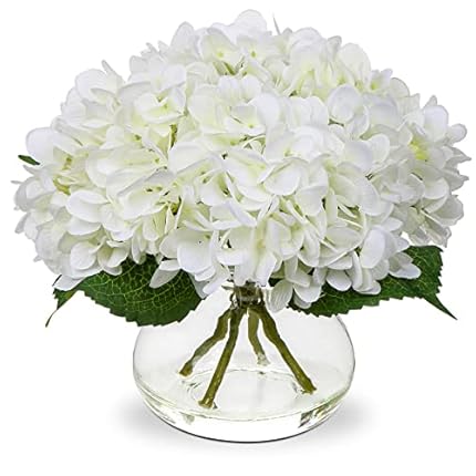 Hollyone Hydrangea Artificial Flowers with Vase White Silk Fake Flowers Arrangements in Glass Vase with Faux Water for Home Bathroom Office Table Centerpiece Shelf Decorations