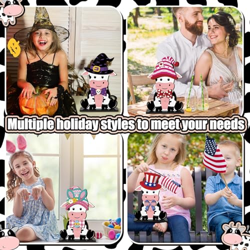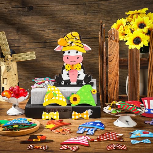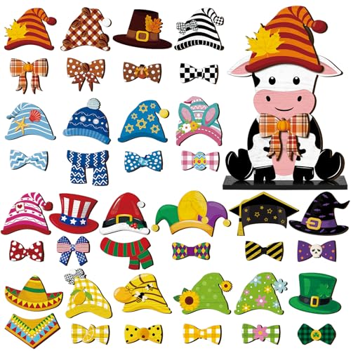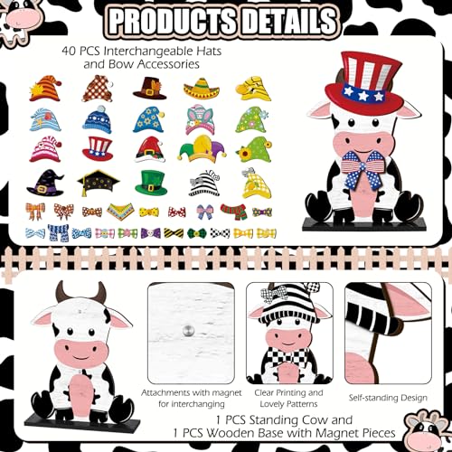 Interchangeable Cow Decor Set: each package includes 1 cow wooden decor, 20 sets of assorted interchangeable holiday hats and bows(40 in total), and 1 sturdy wooden base; These abundant contents allow you to interchange and customize your decor according to the season or festival, breathing life and festive spirit into your home