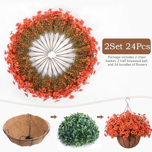 Hananona 24 Pcs Artficial Outdoor Flowers with Hanging Baskets, Orange Fall mums 2 Pack Hanging Planter with Outdoor Fall Flowers for Autumn Porch Garden and Home Patio Yard Decor (2, Orange)
