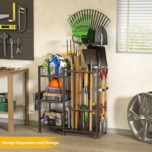 keomaisyto Garden Tool Organizer With Basket – 3 Tier Yard Storage Rack for Garage Organization, Heavy Duty Holder With 35 Long-Handled Slots for Shed, Yard, Garage