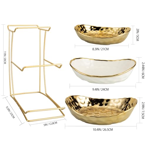 YYW 3 Tier Fruit Bowl for Kitchen Counter, White Gold Ceramic Fruit Stand for Countertop, Home Fruit Rack with Holder, Vegetable Bowl Snacks Nuts Bread Candy Storage (Gold)